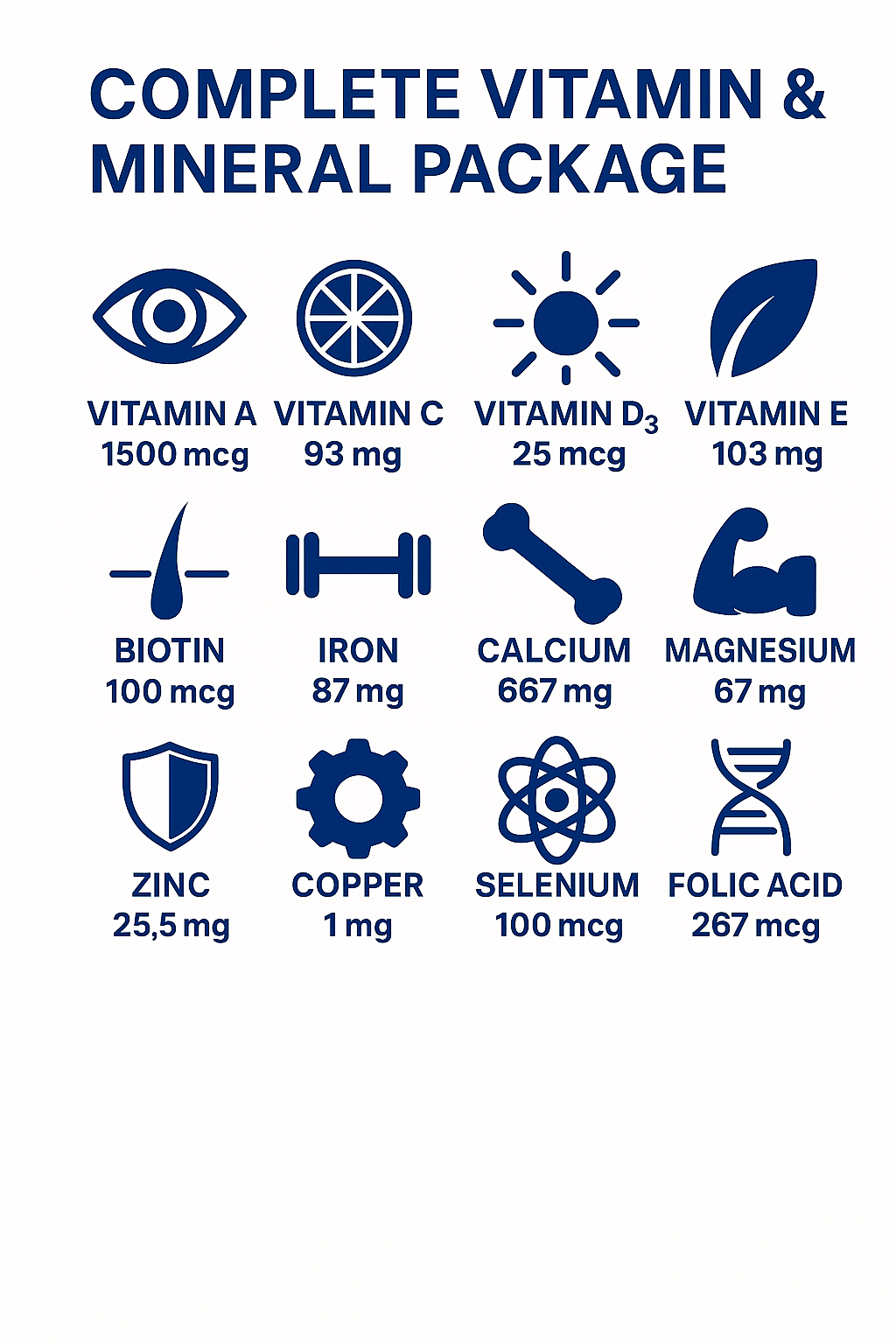 - Contains essential micronutrients in both fat-soluble and water-miscible vitamins and amino acid chelated minerals.
