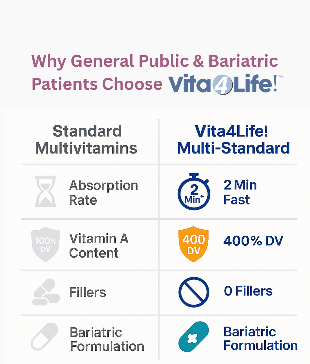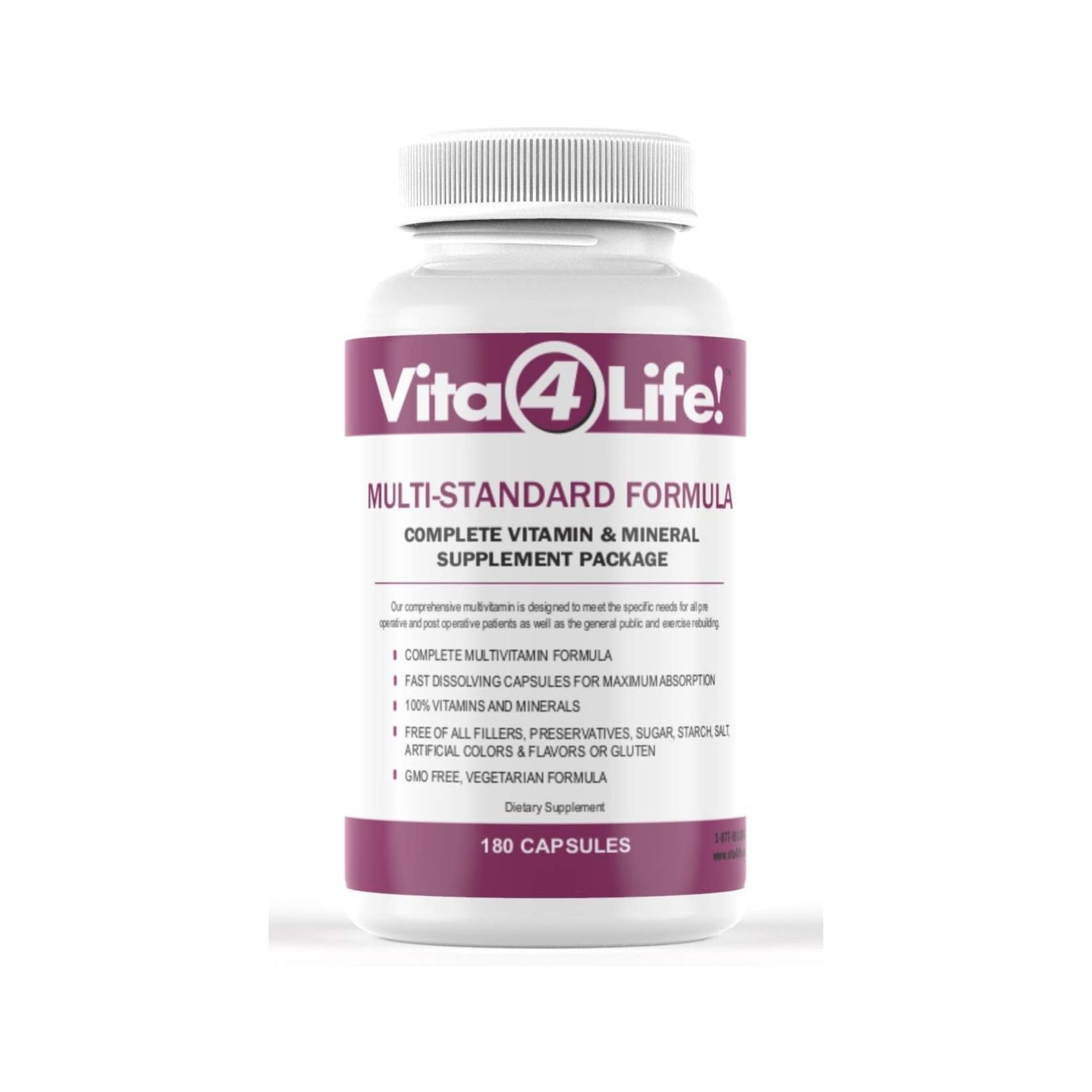 The differences: Our Multi-Standard formula contains more vitamin A, more vitamin E, and a smaller concentration of iron than our Multi-Plus Formula. Unlike our Multi-Plus Formula (designed for those who have undergone bariatric surgery such as gastric bypass), our Multi-Standard Formula contains more vitamin A, more vitamin E, an average concentration of iron. We have made this product to meet the nutritional requirements of those patients who have undergone every type of by-pass procedure whether it be invasive or non-invasive surgery. Our capsule has complete dissolution time of less than two minutes*. This allows for maximum absorption in the shortest amount of time. Our capsules are never an issue with any type of bypass either invasive or non-invasive.